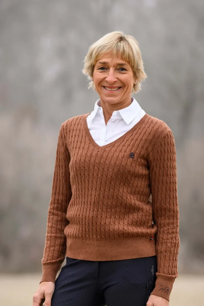 På vänster bröst pryds tröjan av ett Cavallo-stigbygelbroderi i kontrast, och vid vänster ärmslut finns ett elegant Ingrid Klimke by Cavallo-tryck i kontrast, som ger en subtil men lyxig detalj. Ribbstickade muddar i ärmar och nederkant säkerställer optimal passform och hög bärkomfort.