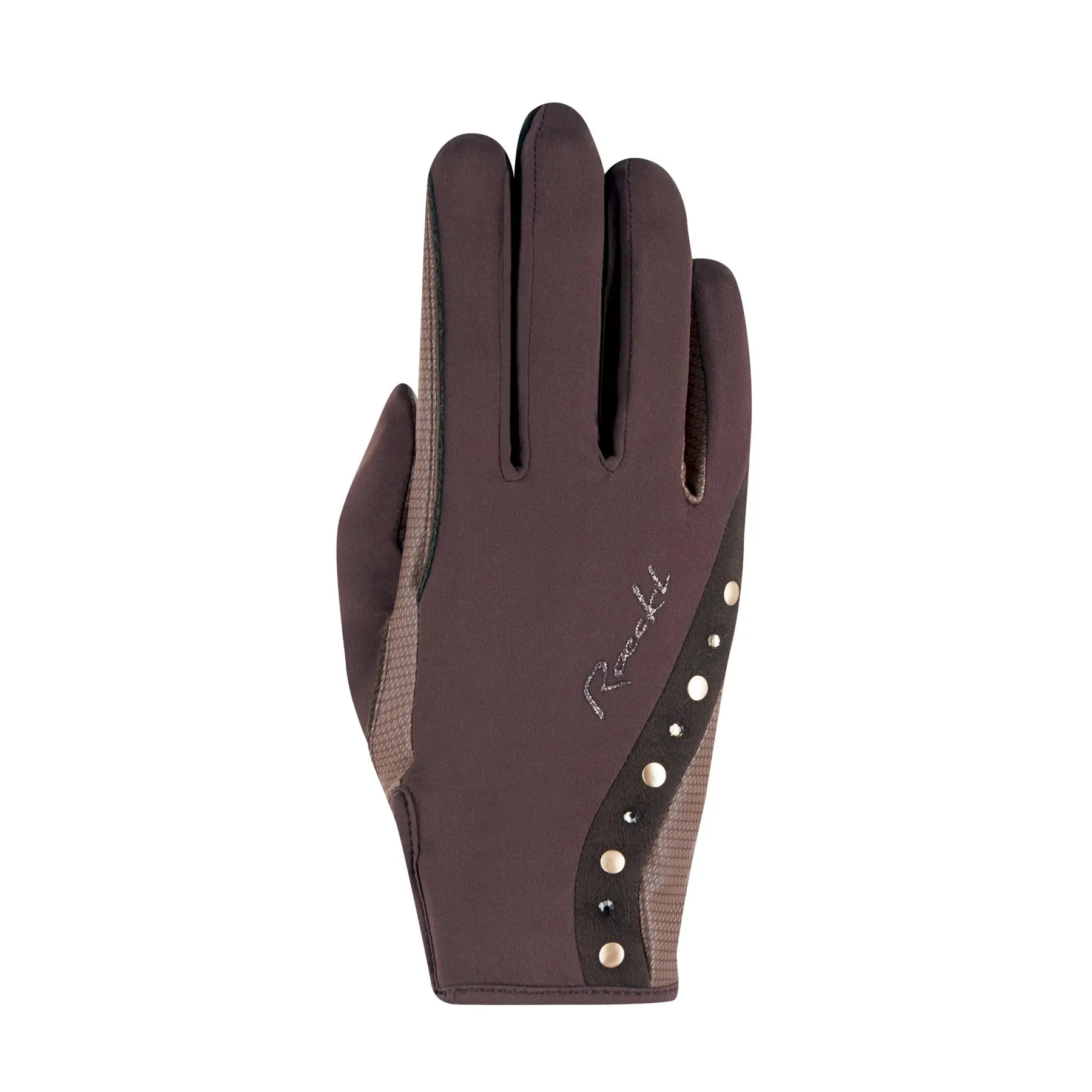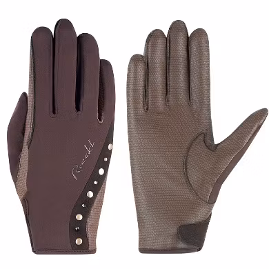 Handsken har en utmärkt passform och är tillverkad i mjuka, elastiska material som ger optimal rörelsefrihet. Det förstärkta greppet i handflatan samt mellan ring- och lillfinger säkerställer ett stabilt och säkert grepp om tyglarna. Den exklusiva designen fulländas av växelvis nitar och Swarovski-stenar, som ger handsken ett elegant och iögonfallande uttryck.